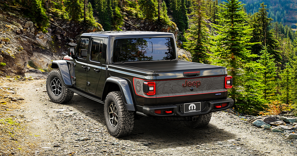 The Mopar ’24 Gladiator features a menacing black clear-coat exterior. It carries one-of-a-kind topographical Rubicon trail graphics on the hood, bed sides, and tailgate, accented with a red tracer and highlighted with the Jeep Performance Parts (JPP) logo.